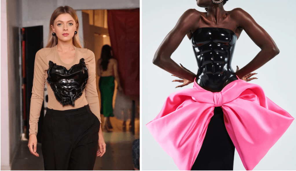 The other piece in the show was a sultry black piece with a design evoking the iconic aesthetic of medieval armor with a contemporary twist. The meticulously crafted contours, reminiscent of chiseled abs, imbue the garment with a sense of strength and empowerment, blending the feminine silhouette of a bodice with the sculptural masculinity of an eight-pack. It embodies a sense of understated elegance through the simplicity of color choice but commanding nature in its subtle yet impactful statement. Drawing parallels to Schiaparelli’s innovative corsets from the Spring 2021 collection, which similarly featured abdominal detailing, suggests a thematic exploration of “hard chic” within women’s wear, wherein traditional notions of femininity intersect with elements of strength and resilience. Through such nuanced design choices, Isabel invites viewers to reconsider conventional standards of beauty and to embrace the multifaceted nature of contemporary femininity.