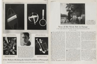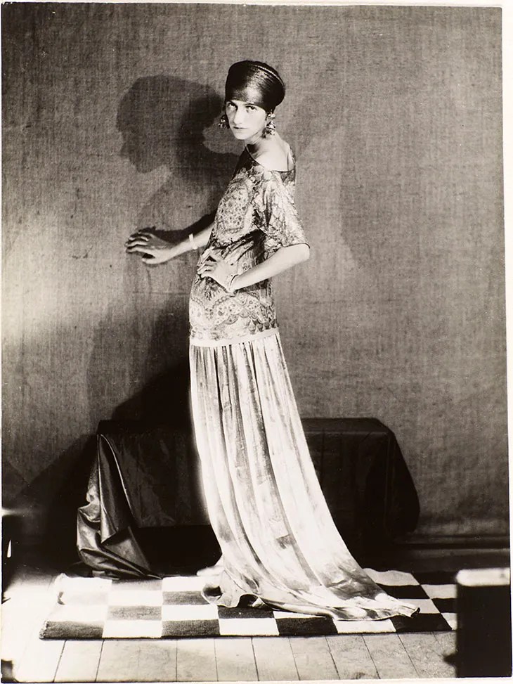 This technique caught the attention of the editors at Vanity Fair, who featured several of Man Ray’s rayographs in the November 1922 issue. After the success of his article in Vanity Fair, Man Ray became a popular photographer for other large fashion publications such as Vogue and Harper’s Bazaar. He also regularly photographed upper-class society figures like Peggy Guggenheim wearing high-fashion pieces, and these photographs were featured in fashion magazines such as Vogue. In this particular portrait, Ms. Guggenheim, who is wearing an exotic design with opulent details by Paul Poiret, has assumed an unexpected pose and shadows mirror her form.
